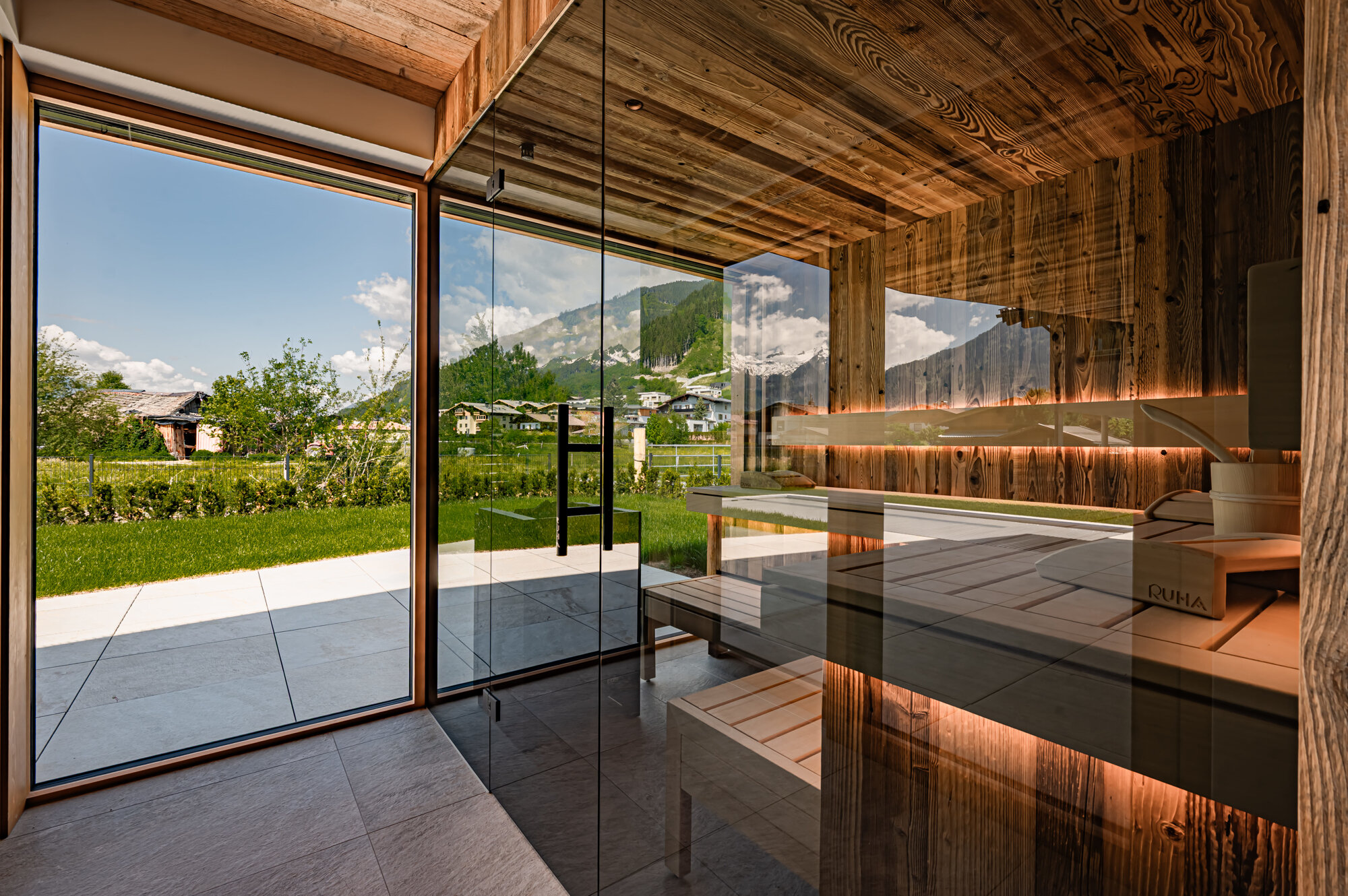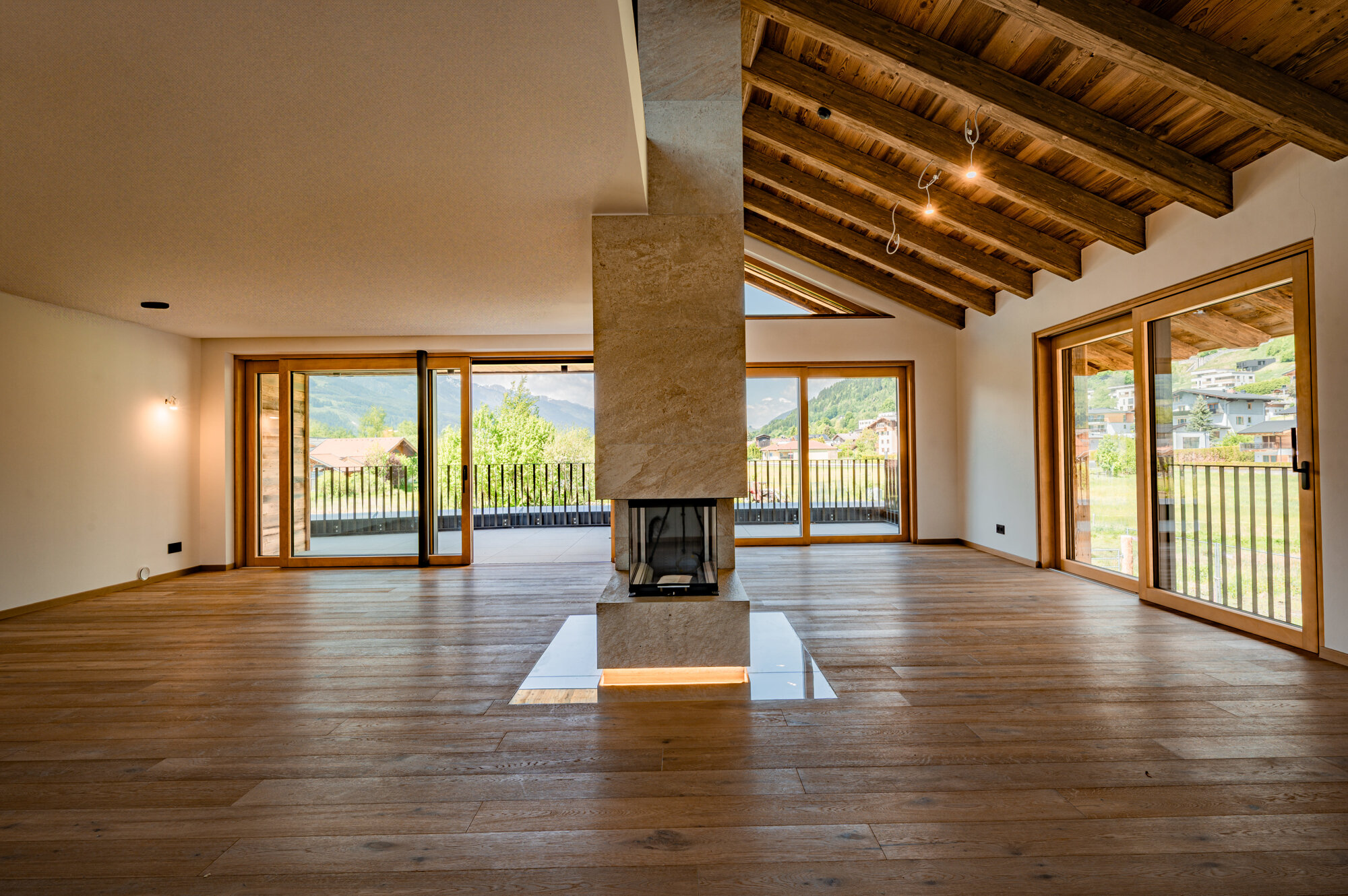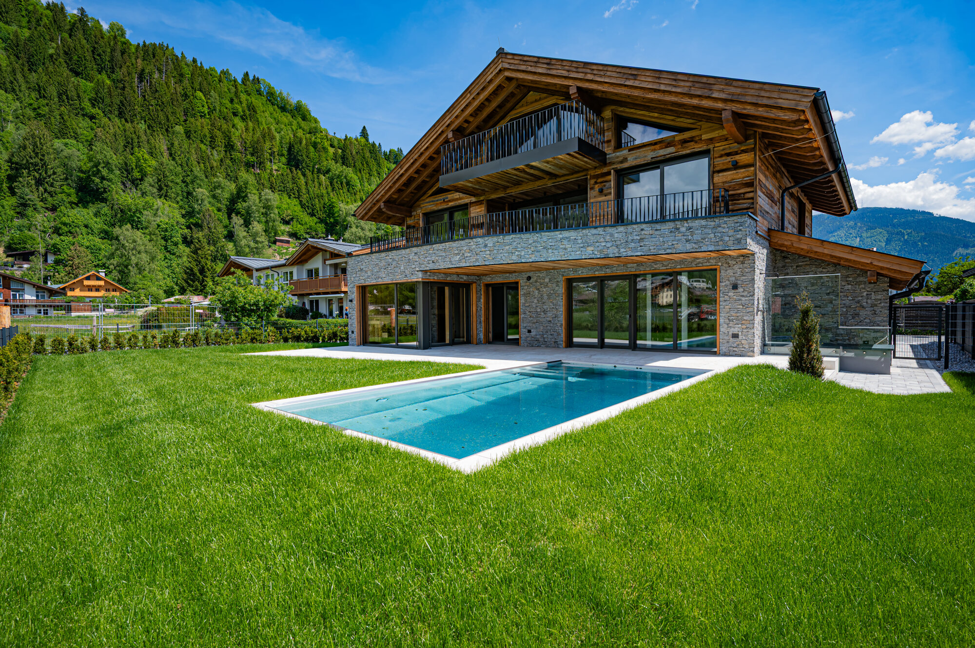 3 Schlafzimmer, 3 Badezimmer, Wohn-Nutzfläche ca. 326m², Grundstücksgröße 632m², 105,70m² Terrassen & Balkon, Outdoor Pool, Wellnessbereich, Doppelgarage, hochwertige Bauweise mit Eichenböden und Feinsteinzeug in den Bädern, modernste Technik, Fußbodenheizung, Fertigstellung Ende 2024, Blick auf das Kitzsteinhorn;