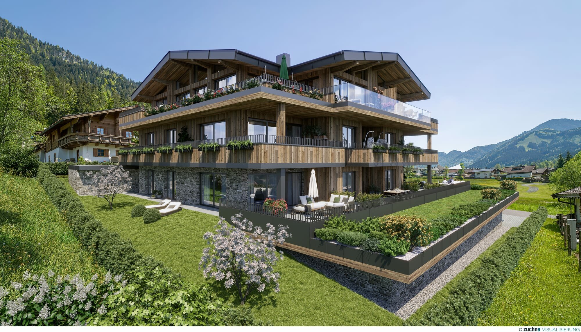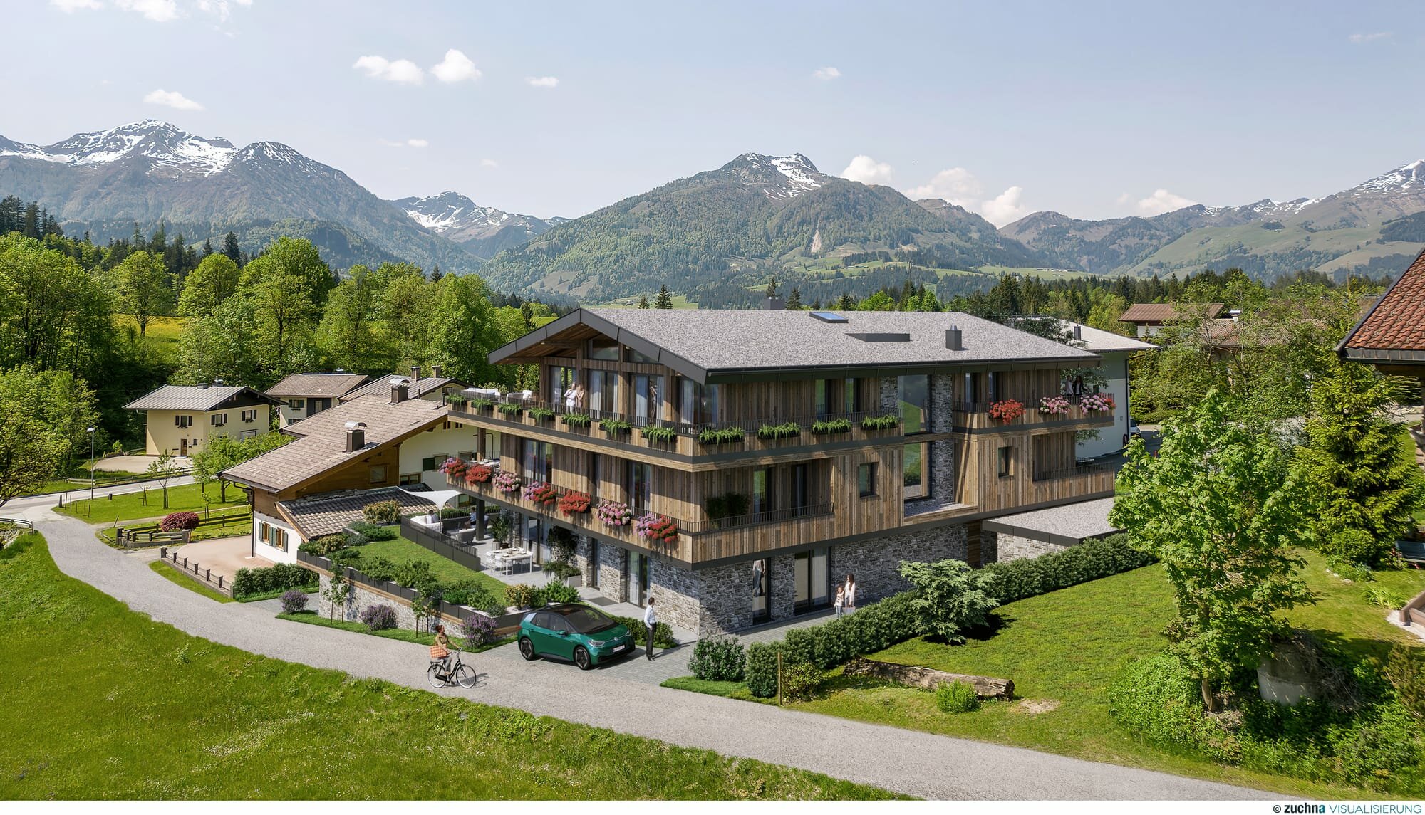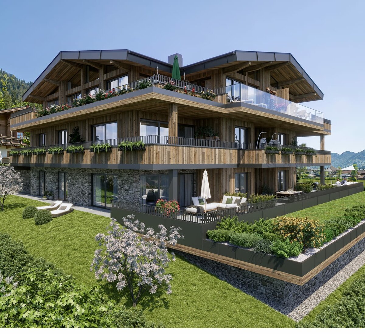 Modern-Alpiner Neubau mit 8 Einheiten, zwischen ca. 35-108m² Wohn/Nutzfläche, ab 1 Schlafzimmer/1 Badezimmer, Pellets-Fußbodenheizung, sonnige Balkone/Terrassen, Aufzug, Tiefgarage, Eichenböden, moderne Bäder; *Energieausweis in Arbeit*
